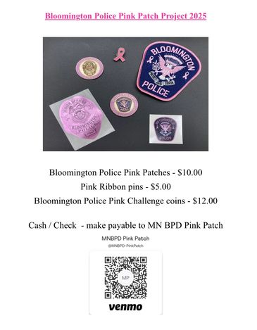 The Bloomington Police Department joined the Pink Patch Project in 2021 and donates proceeds to the Randy Shaver Cancer Research and Community Fund and American Cancer Society.